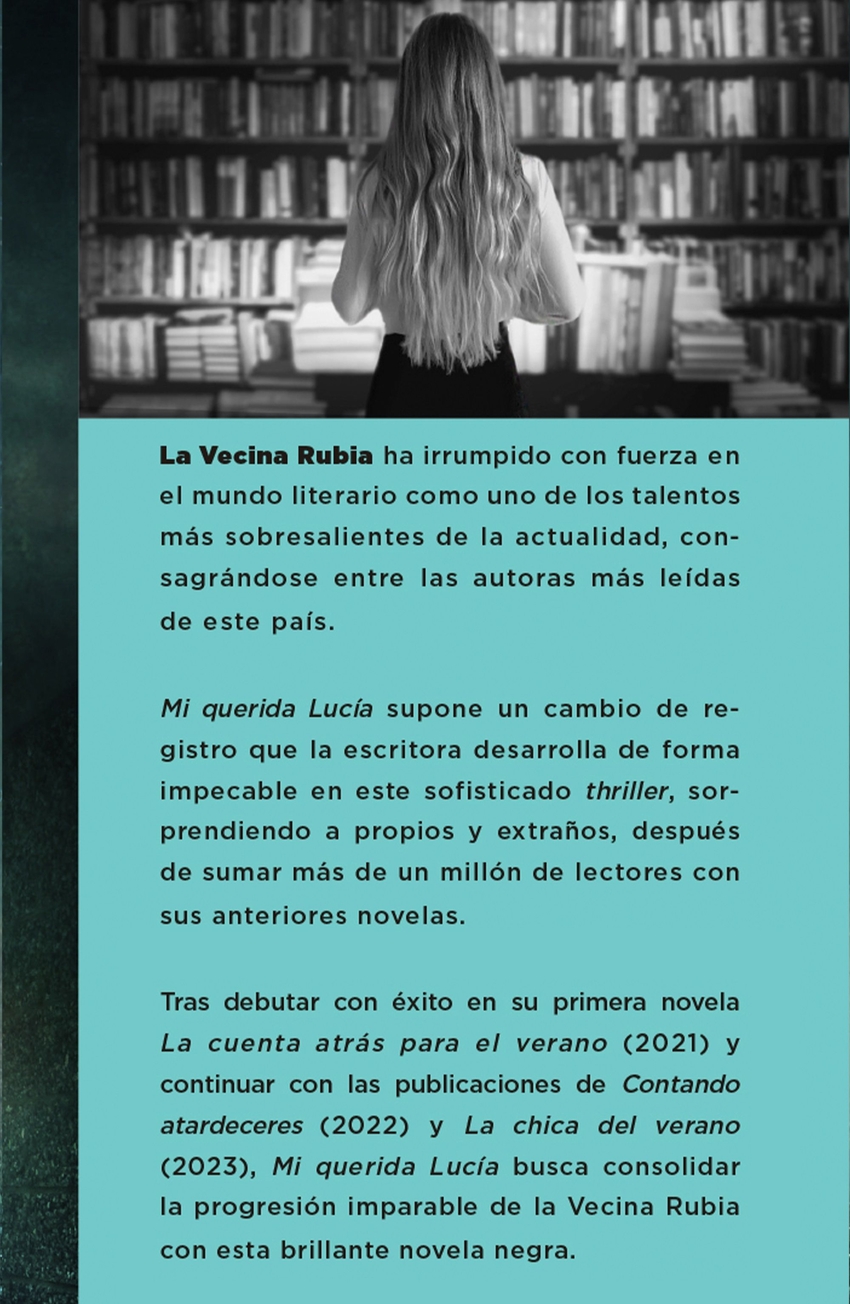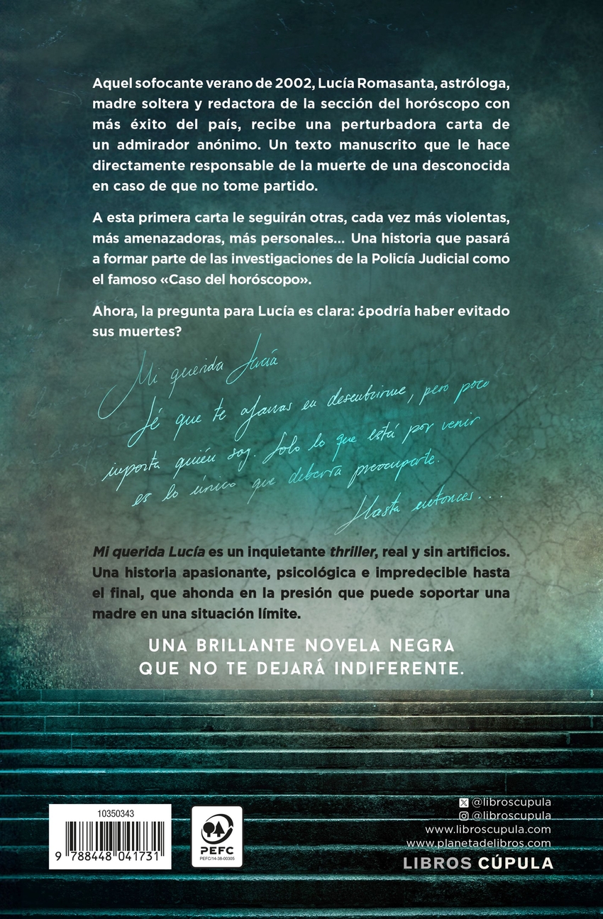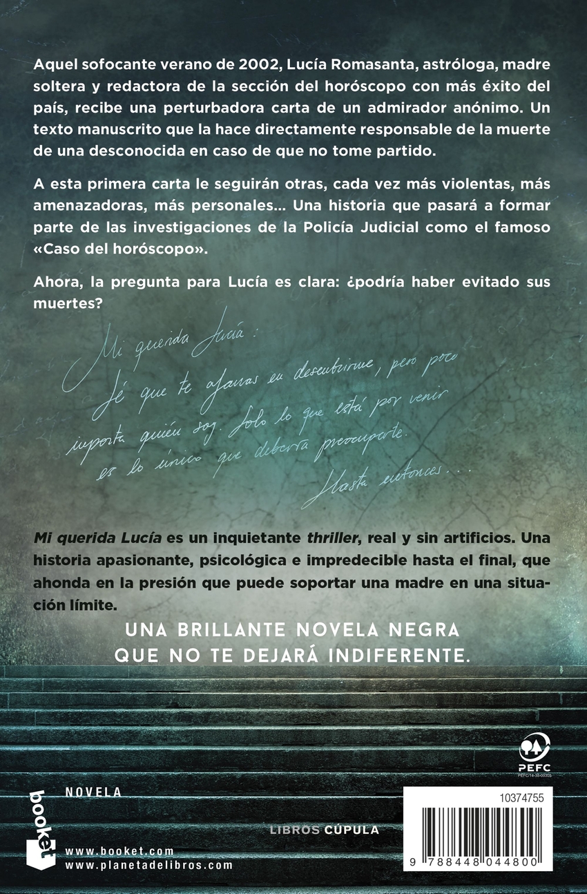 Una brillante novela negra que no te dejará indiferente.Aquel sofocante verano de 2002, Lucía Romasanta, astróloga, madre soltera y redactora de la sección del horóscopo con más éxito del país, recibe una perturbadora carta de un admirador anónimo. Un texto manuscrito que la hace directamente responsable de la muerte de una desconocida en caso de que no tome partido. A esta primera carta le seguirán otras, cada vez más violentas, más amenazadoras, más personales Una historia que pasará a formar parte de las investigaciones de la Policía Judicial como el famoso «Caso del horóscopo». Ahora, la pregunta para Lucía es clara: ¿podría haber evitado sus muertes Mi querida Lucía es un inquietante thriller, real y sin artificios. Una historia apasionante, psicológica e impredecible hasta el final, que ahonda en la presión que puede soportar una madre en una situación límite.