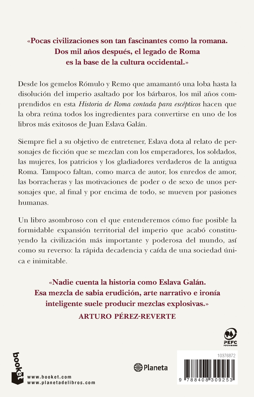 «Pocas civilizaciones son tan fascinantes como la romana. Dos mil años después, el legado de Roma es la base de la cultura occidental.»Desde los gemelos Rómulo y Remo que amamantó una loba hasta la disolución del imperio asaltado por los bárbaros, los mil años comprendidos en esta Historia de Roma contada para escépticos hacen que la obra reúna todos los ingredientes para convertirse en uno de los libros más exitosos de Juan Eslava Galán. Siempre fiel a su objetivo de entretener, Eslava dota al relato de personajes de ficción que se mezclan con los emperadores, los soldados, las mujeres, los patricios y los gladiadores verdaderos de la antigua Roma. Tampoco faltan, como marca de autor, los enredos de amor, las borracheras y las motivaciones de poder o de sexo de unos personajes que, al final y por encima de todo, se mueven por pasiones humanas. Un libro asombroso con el que entenderemos cómo fue posible la formidable expansión territorial del imperio que acabó constituyendo la civilización más importante y poderosa del mundo, así como su reverso: la rápida decadencia y caída de una sociedad única e inimitable. «Nadie cuenta la historia como Eslava Galán. Esa mezcla de sabia erudición, arte narrativo e ironía inteligente suele producir mezclas explosivas.» Arturo Pérez-Reverte