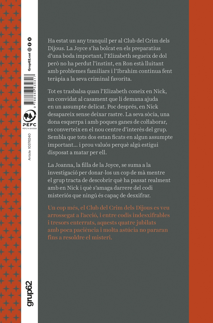 Torna el Club del Crim dels Dijous amb un altre misteri sorprenent.Qui té temps per pensar en assassinats quan hi ha un casament per organitzar Ha estat un any tranquil per al Club del Crim dels Dijous. La Joyce està ocupada amb la distribució de les taules de convidats i els balls dobertura. LElizabeth està de dol. En Ron senfronta a problemes familiars, i lIbrahim continua oferint teràpia al seu criminal preferit. Però quan lElizabeth coneix un convidat del casament que té problemes, el segrest i la mort tornen a creuar-se en el seu camí. Un malvat vol accedir a un codi indesxifrable, i no saturarà davant de res per aconseguir-ho. Un cop més, el grup es veu arrossegat a lacció. Aconseguiran resoldre lenigma i un assassinat a temps